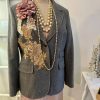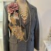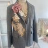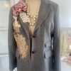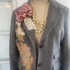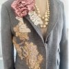 This is such a gorgeous gray blazer! I added this beautiful beaded applique to the side, as well as a handmade silk flower and vintage lace! I finally added my signature pearl drape as well! This blazer buttons up, and is perfect for any occasion!