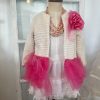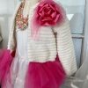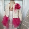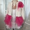 This is an adorable little girl’s faux fur jacket with stunning tulle and satin ruffle flower embellishments.
